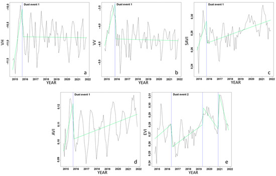 Detection of abrupt changes with the BFAST lite decomposition algorithm for VH (a), VV (b), SAVI (c), AVI polarisation (d), and EVI (e). Green and vertical blue lines indicate the breaks in the trend component. Labelled breakpoints correspond to dust events, while other detected changes may result from different environmental factors.