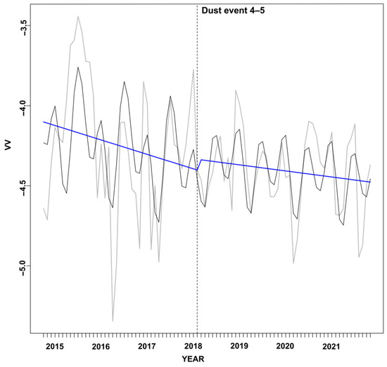 As mentioned earlier, ten VIs were tested for the time-series analysis in this study, but only AVI, SAVI and EVI managed to detect forest disturbance that occurred mainly after a dust event; thus, the analysis of the optical data continues with these selected VIs. Overall, there were eight missing values in the monthly time series of the AVI, SAVI, and EVI, whereas only one missing value existed for the VH and VV polarisation. The Cook’s distance was utilised to identify influential points in the time series, but despite outliers, no values were removed. Assessment of the influential points showed no significant impact on the estimated regression coefficients or the model’s overall fit, ensuring the integrity of the statistical findings.