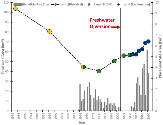 Examination of land and water data derived from historical aerial photography enables the identification and empirical documentation of landscape changes that have occurred within the SWP study area prior to reclamation activities. Figure 3 plots the subaerial land area and dredged material placement sites within the period of analysis timeframe (1934 to 2020). In 1934, the SWP project area (224.4 km2) comprised 120.7 km2 of water (53.8% of total) and 103.7 km2 of wetland (46.2% of total) features. The land area changed consistently across the historical period, decreasing to 80.6 km2 (35.9%) and 44.5 km2 (19.8%) by 1956 and 1978, respectively (Figure 3). The rate of loss was linear (r2 = 0.98) at 1.35 km2 per year across the 44-year historical period of record (1934 to 1978). The incurred losses stem predominantly from compaction-induced subsidence (~1.5 m per century), sediment depletion, erosional forces (i.e., tidal and wave energies), hurricanes, and anthropogenic activities (i.e., navigation O&M and access canal construction for mineral exploration and extraction) [60]. These historical data and trends provide a baseline with which changes during the reclamation period can be compared.