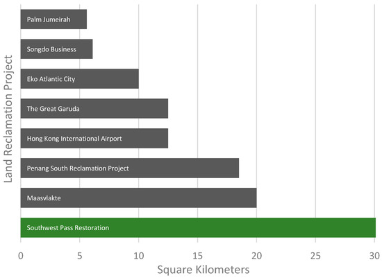 Globally, there has been a notable increase in the interest and implementation of land reclamation projects. Yet, several countries have engaged in land reclamation for over a century. Leading the world in reclaimed lands are China, the Netherlands, South Korea, the United States, and Japan, with reclaimed areas of 13,500 km2, 7000 km2, 1550 km2, 1000 km2, and 500 km2, respectively [61]. Figure 5 highlights some of the world’s largest and most notable reclamation projects, ranging from 5.6 km2 for the iconic Palm Jumeirah in Dubai to 20 km2 for the Maasvlakte 2 project in the Netherlands. While many large-scale reclamation projects are designed for industrial, residential, or mixed-use purposes, some are driven by ecosystem restoration needs. Notably, reclamation activities along SWP associated with both ship channel maintenance and dedicated environmental programs have led to a 30.1 km2 increase in land area, surpassing many prominent global initiatives. The SWP restoration efforts are particularly significant when compared to other major international projects. This initiative has focused on restoring and enhancing coastal ecosystems through BUDM and sediment diversion. These efforts aim to rebuild wetlands, improve habitat quality, and increase biodiversity. The SWP project highlights the critical role of reclamation in supporting ecosystem services, including flood protection, water quality improvement, and carbon sequestration. By prioritizing ecological restoration, the SWP initiative sets a benchmark for future reclamation projects worldwide, demonstrating that large-scale land reclamation can successfully balance human and environmental needs. This positions the SWP project as a notable global effort in reshaping and expanding coastal areas while enhancing their ecological integrity.