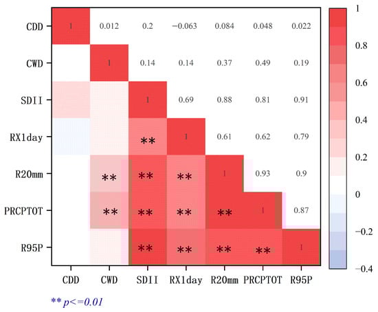 - Correlation analysis reveals that most indices are significantly positively correlated with total precipitation (p < 0.01), except for CDDs, which shows a weak correlation with total precipitation. Among these indices, R20mm has the most pronounced effects on total precipitation.