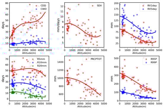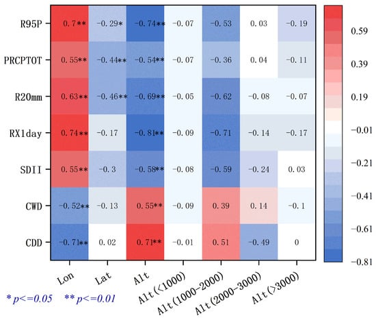 - Regarding geographic factors, most precipitation indices are significantly positively correlated with longitude, negatively correlated with latitude, and negatively correlated with elevation, except for CDDs. This pattern implies that precipitation generally increases from west to east and decreases as one moves northward in Sichuan Province, likely because the eastern part of the Sichuan Basin is closer to the ocean. Drought conditions are more severe at higher altitudes (e.g., the plateau zone in western Sichuan Province), possibly because mountainous terrain obstructs precipitation formation and because cooler temperatures reduce the likelihood of water vapor condensation.