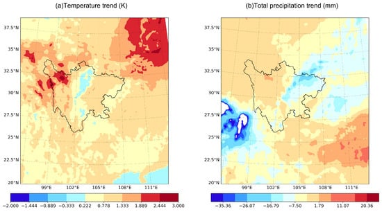 - On the time scale studied, the precipitation indices in Sichuan Province, except for CWDs, show different degrees of increasing trends during the 1970–2022 period, with the SDII showing the most significant increase (p < 0.05). The increasing trends of these precipitation indices were notably larger in summer than in other seasons, with the R95P index showing the largest increase in summer at a rate of 0.57 mm per decade.