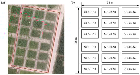 Long-term localization experiment plot map: (a) UAV aerial photo of the test plot, where the red box indicates the test plot; (b) schematic diagram of the test plot layout, where X in X-Y-Z represents the tillage method, Y represents the straw return treatment, and Z represents the nitrogen fertilizer application rate. The abbreviations of the treatments are provided in Table 1.