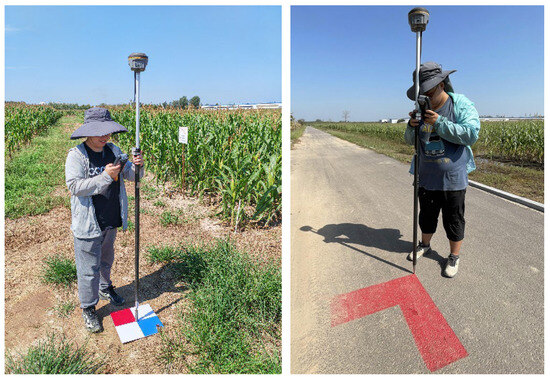 In order to accurately locate the plant-scale corn research objects in the UAV imagery, ground control points (GCPs) were arranged around and in the center of the experimental field. As shown in Figure 3, the placement of the GCPs in the field was realized using a hollow steel pipe inserted into the ground and a position marker plate inserted into the ground, and GCPs on the asphalt road were realized by painting. All GCPs were recorded with the longitude and latitude coordinates of the CGCS2000 coordinate system using the RTK-GNSS measuring instrument.