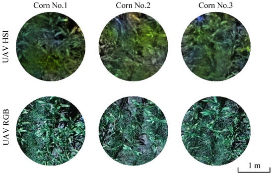 Some representations of the UAV HSI and RGB orthophoto for corn canopy are shown in Figure 4. The UAV RGB orthophoto has richer texture information than the UAV HSI orthophoto, so the UAV RGB orthophoto was employed for subsequent data cleaning.