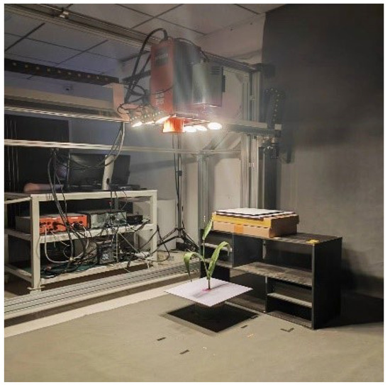 A visible–near-infrared hyperspectral camera with a wavelength range of 400–1000 nm (Image-λ-V10E, Dualix, Wuxi, China) was utilized to capture the hyperspectral data of each corn canopy leaf in the darkroom. A custom HSI measurement station, as shown in Figure 5, was used to scan the sample. This station used a horizontal motor to move the hyperspectral camera in the horizontal direction, thereby enabling spectral imaging data acquisition of corn canopy leaves at the plant scale. The vertical motor was utilized to control the camera’s vertical movement, ensuring a fixed object distance of 70 cm in this study. Six 50 W DC halogen lamps, positioned with fixed relative locations to the camera, served as light sources. The scanning parameters of the camera were as follows: The Image-λ-V10E facet array sensor can simultaneously capture 960 × 176 pixel data in both spatial and spectral dimensions and is equipped with an HSIA-OLE23 imaging lens. It is configured with an exposure time of 23 ms, a frame rate of 43 Hz, and a scanning speed of 1.15 cm/s. Precise focusing was achieved by manually fine-tuning the camera’s lens focusing ring. A 300 × 300 mm whiteboard (SphereOptics, Herrsching, Germany) with 95% reflectivity was used as a reflectance correction material. The camera dark current signal was collected every 30 min. During the scanning process, the indoor environment was maintained under stable conditions with minimized ambient light interference.