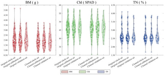 As the snapshot UAV HSI used in this study was obtained by bicubic interpolation sharpening, the plant-scale corn canopy leaf signals in the HSI contained interference from neighboring pixels. Therefore, in this study, RGB images were employed to identify and eliminate the data points with interference by corn lodging, weeds, soil, adjacent plants, or miscellaneous items in order to clean the UAV HSI data. A total of 22 sample points were removed, and a comparison of the BM, Chl, and TN content distributions in the sample set before and after data cleaning is shown in Figure 8. According to the data presented in the figure, there was no statistical difference (p > 0.05) between the calibration or validation set, and the distributions of the BM, Chl, and TN contents in the sample set after data cleaning presented no changes (p > 0.05), indicating that data cleaning did not affect the representativeness of the sample.