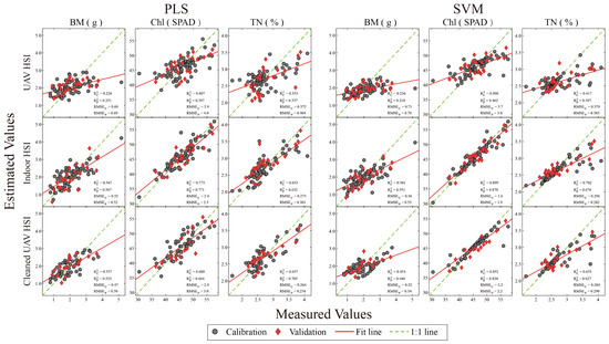 After data cleaning, the R2C values of the BM, Chl, and TN contents detected with the UAV HSI reached 0.537, 0.852, and 0.657, respectively, representing an improvement of over 70% when compared to that before data cleaning. The evaluation results on RMSEP were also impressive: BM was detected as low as 0.50 g, nearly matching the 0.52 g achieved by the indoor HSI detection model; Chl was detected as low as 2.2 SPAD, which showed greater precision than the 5.57 SPAD and 2.65 SPAD obtained with UAV HSI detection models in previous studies [32,33] and was similar to the 1.9 SPAD achieved by indoor HSI detection in this study; and TN was detected as low as 0.258%, which was superior to the 0.282% achieved by the indoor HSI detection model in this study and showed greater precision than the 0.521% and 0.26% obtained with UAV HSI detection models in previous studies [34,35] using SVMR.