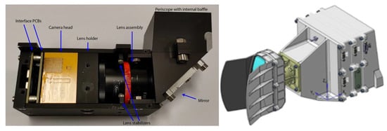 Hera is a planetary defense mission demonstrator within the ESA Space Safety and Security Programme (S2P) []. Its main goals are (1) to characterize the physical properties of the target binary asteroid (65803) Didymos–Dimorphos and (2) to document the consequences of the 2022 NASA Double Asteroid Redirect Test (DART) spacecraft’s impact on Dimorphos []. Hera also carries two 6-unit CubeSats, Juventas and Milani, which will be deployed upon arrival in the vicinity of the two asteroids and will carry on specialized proximity observations. The primary payload of Milani CubeSat is the ASPECT hyperspectral camera [] tasked with mapping the target mineral composition and surface maturity. ASPECT (Figure 2) in its imaging range will capture 2D images for each recorded wavelength, forming a hyperspectral datacube containing a full spectrum for each pixel. ASPECT consists of three imaging channels: visible (Vis) and two near-infrared (NIR1 and NIR2), one additional single point short-wave infrared (SWIR) spectrometer (basic parameters in Table 1), and a dedicated Data Processing Unit (DPU) based on the Xiphos Q7S system-on-chip. The DPU runs the Linux operating system on an ARM dual-core Cortex A9 MPCore CPU. Its purpose is to support basic instrument operation and data handling, as well as to execute advanced image processing functions such as coverage and sharpness detection and JPEG 2000 compression using JasPer library, v4.2.4. See https://jasper-software.github.io/jasper/, https://www.ece.uvic.ca/~frodo/jasper/ (accessed on 26 February 2025). One complete uncompressed ASPECT hyperspectral datacube with 72 wavelengths is 364.8 Mbits and the total estimated data volume to transmit during the whole mission is approximately 10 Gbits.