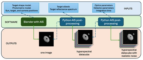 Testing the compression and noise filtering algorithms before mission launch requires synthetic test data, i.e., hyperspectral datacubes presenting realistic scenes for the mission. For this purpose, an end-to-end Asteroid Image Simulator (AIS), see https://bitbucket.org/planetarysystemresearch/asteroid-image-simulator (accessed on 26 February 2025) for the current development version, was developed and used to simulate ASPECT observations of the Didymos binary asteroid with realistic instrument performance. The test data creation is a three-step process. First, the Blender 3D modeling, v3.6 software, https://www.blender.org/ (accessed on 26 February 2025), with added functionalities from the AIS package is used to create simulated images. These images are of high resolution and free of any imaging noise coming from the detector. Second, the simulated images are expanded into different wavelengths for the hyperspectral datacube in our AIS, v0.9, Python post-processing scripts. Finally, the grayscale units of an image are transformed into digital numbers (DNs) of the detector and the detector noises are simulated on the datacube frames. Figure 3 shows the flow of inputs and outputs in the process.