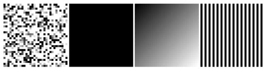 Images used to find edge cases in the CCSDS 122.0 image compression algorithm. From left to right: white noise, pure black, smooth gradient and vertical stripes.
