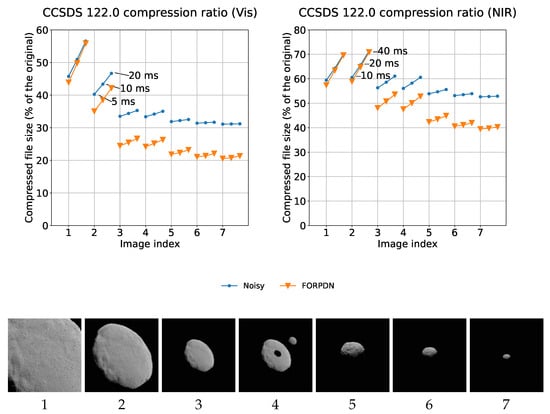 Figure 9 shows that both CCSDS 122.0 and JPEG 2000 compress asteroid-dominated Vis images to under 60% of the original. This compression ratio increases to slightly over 30% for space-dominated images. Moreover, the space-dominated images increasingly benefit from noise filtering. Notably, a subset of these images compress to under 10% when the HyRes filter is applied. Compression ratio roughly inversely correlates with the increasing simulated imaging distance (space-dominated images compress better than asteroid-dominated ones) regardless of noise reduction methods used.