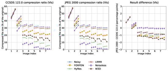 Performance of the CCSDS 122.0 and JPEG 2000 compression algorithms on three exposure levels of the noiseless, noisy and filtered visible spectrum images. Filtering is performed with FORPDN, HyRes, LRMR and W3D.