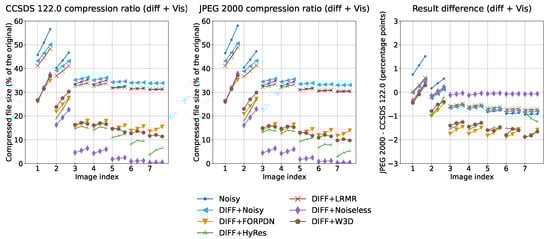 An increase of up to 10 percentage points (pp) in compression ratio is achieved by differentially encoding asteroid-dominated images as seen in Figure 10. On the contrary, slightly worse results are produced when non-filtered space-dominated images are differentially encoded. Finally, applying each noise filter, except LRMR, increases the overall compression ratio further by 15 to 20 pp.