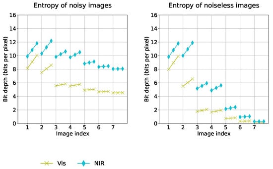 The entropy of three exposure levels of noisy Vis and NIR images (left) and their noiseless variants (right).