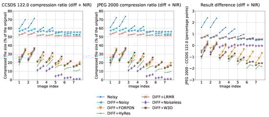 The performance of the CCSDS 122.0 and JPEG 2000 compression algorithms on three exposure levels of filtered and noisy differentially encoded near-infrared images. Filtering is performed with FORPDN, HyRes, LRMR and W3D.