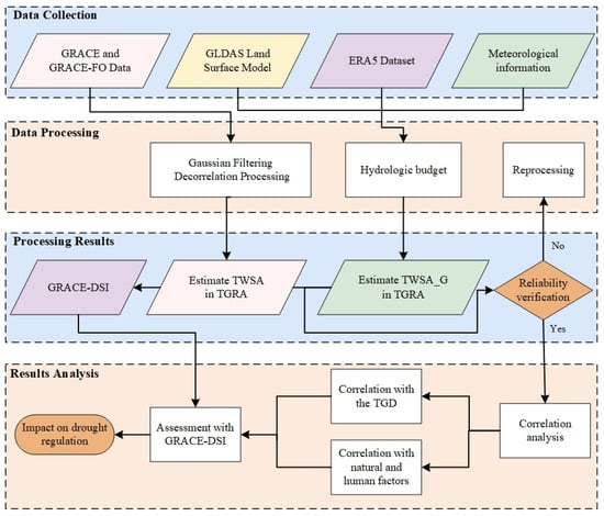 In this study, we integrated GRACE and GRACE-FO data with ERA5, GLDAS, and in situ water level measurements to systematically analyze the long-term TWSA variations in the TGRA over the period 2003–2023. TWSA estimates were derived using preprocessing operations such as Gaussian filtering and decorrelation processing to enhance data quality (see Section 2.2 and Section 3.1 for details) [48,49,50]. Building on this foundation, the GRACE Drought Severity Index (GRACE-DSI) was employed to evaluate the impact of dam operations on mitigating droughts within the basin. Additionally, correlation analysis was performed to identify the statistical relationships between TWSA and natural and anthropogenic factors. This analysis quantified their respective contributions to basin-wide TWSA changes. The research workflow is depicted in Figure 1.