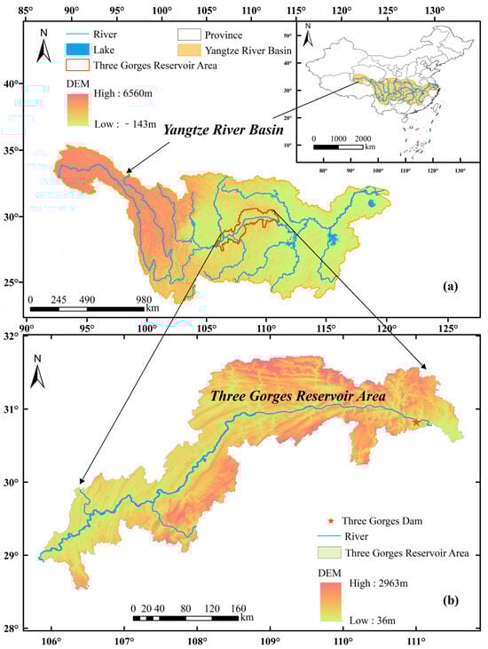 Location of the research area and related watersheds ((a) the location of the Yangtze River basin; (b) the location of the TGRA).