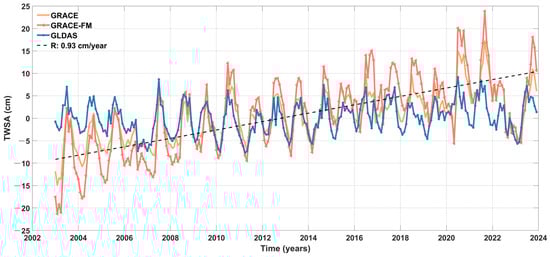 Comparison of TWSA derived from GRACE, GRACE-FM, and GLDAS datasets for the TGRA from 2003 to 2023. R represents the rate of change in TWSA reflected by GRACE-FM.