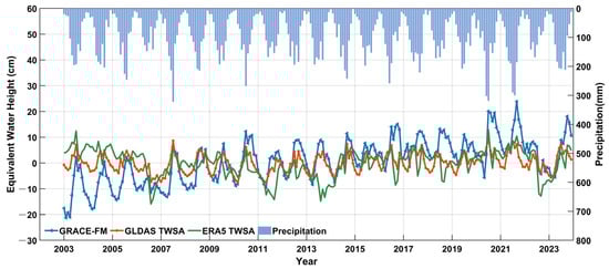 TWSA time series (2003–2023) for the TGRA derived from GRACE-FM, GLDAS, and ERA5, alongside precipitation data from 1 km monthly precipitation dataset for China.