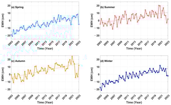Seasonal variations in TWSA time series for the TGRA: (a) spring, (b) summer, (c) autumn, (d) winter.