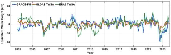Overall, the long-term trends indicate high consistency among GRACE-FM, GLDAS TWSA, and ERA5 TWSA results, with peaks and troughs aligning closely (Figure 4). However, the amplitudes of GLDAS and ERA5 are smaller than those of GRACE-FM. To further explore TWSA anomalies, we removed long-term trends and seasonal components from the time series (Figure 6). De-trending removes long-term variability driven by factors such as climate change and human activities, highlighting short-term deviations from expected trends. Deseasonalizing removes cyclical fluctuations caused primarily by the hydrological cycle (e.g., precipitation) and helps reveal non-seasonal anomalies and extreme hydrological events. The detrended and deseasonalized TWSA series reveals strong temporal consistency among GRACE-FM, GLDAS, and ERA5, though ERA5 exhibits larger amplitudes, particularly during negative anomalies in 2006, 2011, and 2013. Conversely, GRACE-FM captures more pronounced anomalies in 2022. These results suggest that ERA5 demonstrates higher sensitivity in detecting extreme hydrological events, while GRACE-FM provides a more comprehensive representation of overall water storage variations.