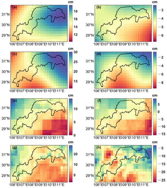 Spatial distribution of TWSA in TGRA based on different data sources. (a,c,e,g) represent the spatial distribution results of TWSA in the TGRA for September 2021, calculated using GRACE, GRACE-FM, GLDAS, and ERA5, respectively; (b,d,f,h) represent the spatial distribution results of TWSA in the TGRA for September 2022, calculated using GRACE, GRACE-FM, GLDAS, and ERA5, respectively.