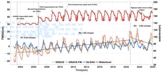 Changes in TGD water level and TWSA from GRACE, GRACE-FM, and GLDAS. The solid black line represents the trend of GRACE-FM for three periods: the first period from July 2003 to October 2006, the second from October 2006 to August 2020, and the third from August 2020 to December 2023. The dashed black lines indicate the time points separating the three periods: the first is July 2003, the second is October 2006, and the third is August 2020. Milestones for water storage are annotated.
