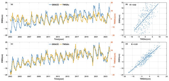 Time series and correlation analysis of GRACE data with natural and human TWSA. Note that the correlation coefficient R has no units ((a) GRACE data and time series of natural TWSA; (b) Correlation analysis between GRACE data and natural TWSA; (c) GRACE data and time series of artificial TWSA; (d) Correlation analysis between GRACE data and human TWSA).