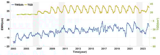 Historical water level data for the TGD were obtained from the following website: http://xxfb.mwr.cn/hh_hs.html, accessed on 1 September 2024, covering the period from August 2003 to December 2023. These records include daily measurements of water levels, reservoir storage volumes, and discharge flows. Monthly water level data were derived by aggregating and averaging daily measurements and were used to analyze the relationship between TGD operations and TWSA variations.