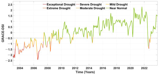 Despite the occurrence of another extreme drought event in 2022, the GRACE-DSI results indicate that its impact was effectively controlled. By regulating the storage and distribution of water resources, the TGD significantly reduced the negative ecological and socio-economic impacts of the drought. The long-term trend observed in Figure 11 illustrates a clear reduction in both the frequency and intensity of extreme drought events within the basin following the TGD’s operation, validating the sensitivity and applicability of GRACE-DSI in assessing drought dynamics and dam-regulation effects.