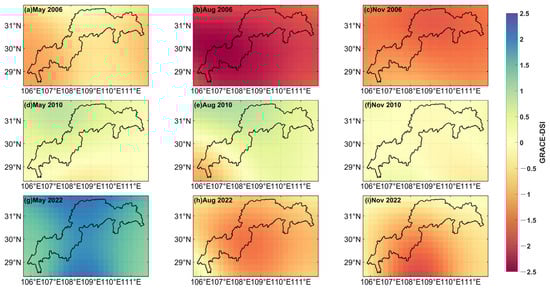To further investigate the spatial characteristics of GRACE-DSI, we analyzed the spatial distribution of drought indices for critical months (May, August, and November) in 2006, 2010, and 2022 (Figure 12). The uniform color gradient reflects varying drought levels, with red representing severe drought and blue indicating water abundance. The horizontal arrangement of years and the vertical alignment of months provide a comparative perspective.
