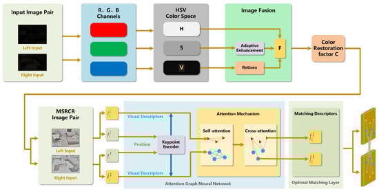This article is organized as follows: Section 2 presents a comprehensive analysis of the retinex-based feature enhancement algorithm and examines the SuperGlue feature matching algorithm, culminating in the proposal of our novel integrated approach that combines MSRCR and SuperGlue. Section 3 details the comparative experimental evaluation of the proposed matching method, with particular emphasis on its accuracy in low-light image matching scenarios. Section 4 provides an in-depth discussion of the method’s effectiveness and implications. Finally, Section 5 presents conclusions drawn from the experimental findings and their analysis.