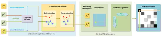 SuperGlue is a feature matching network proposed by Sarlin [20] in 2020. It takes as input the keypoints and descriptors of two images, which are provided by feature extraction algorithms and deep learning networks. The SuperGlue matching network consists of an attentional graph neural network and an optimal matching layer, integrating feature point positions and visual descriptors extracted by the SuperPoint feature extraction network. The attentional graph neural network encodes keypoints and descriptors into a feature matching vector using a keypoint encoder, which is iteratively aggregated via attention mechanisms to enhance the feature matching vector. The enhanced feature matching vector serves as input to the optimal matching layer, where a score matrix is computed and the optimal feature assignment matrix is iteratively solved using the Sinkhorn algorithm, as shown in Figure 3. Within the attentional graph neural network, feature aggregation is performed using encoders followed by information aggregation facilitated by attention mechanisms.