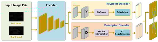 The SuperPoint network [38] is a network designed for feature point extraction and descriptor generation, consisting of two main components: an encoder and a decoder. The architecture diagram of the SuperPoint network is shown in Figure 4.