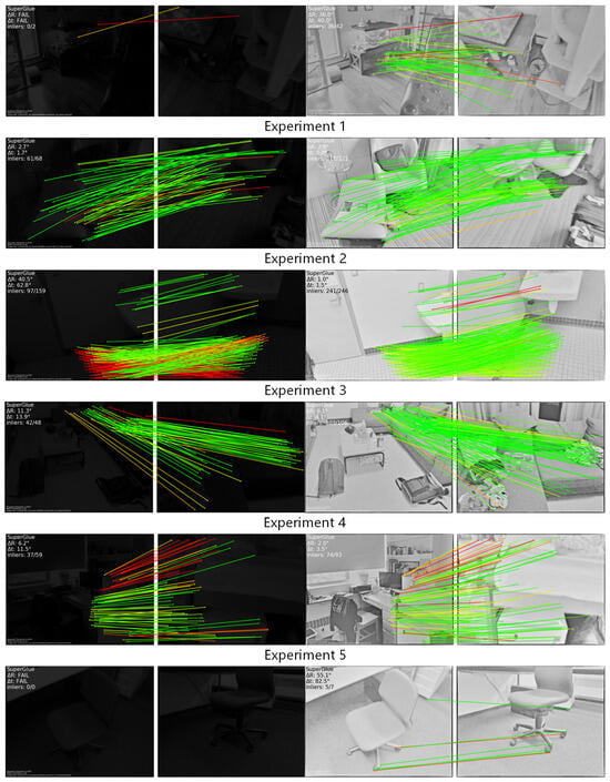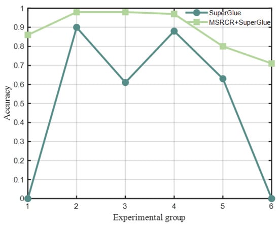 Analysis of Table 3 and Figure 11 demonstrates that MSRCR feature enhancement yields substantial improvements in both the absolute number of matches and correct correspondence rates across the dataset’s low-light images. The enhancement methodology exhibits particularly notable efficacy in cases of severe degradation, as evidenced by experimental groups 5 and 6, where initial matching attempts yielded no correspondences but post-enhancement processing produced satisfactory matching results. For visualization purposes in the precision analysis, the matching score for the fifth group was normalized to zero in the corresponding line graph.