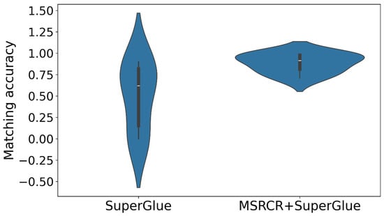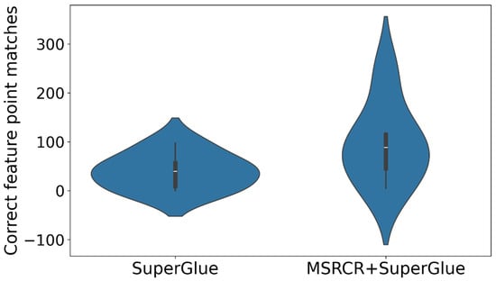 Using the x-axis to represent SuperGlue and MSRCR+SuperGlue, and the y-axis to represent the number of correctly matched feature points and the correct matching rate, the density distribution plot is drawn as shown in Figure 8 and Figure 9.