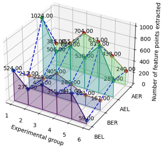 Number of extracted feature points. BEL represents the number of feature points extracted from the left image before MSRCR enhancement, BER represents the number of feature points extracted from the right image before enhancement, AEL represents the number of feature points extracted from the left image after enhancement, and AER represents the number of feature points extracted from the right image after enhancement.