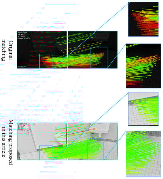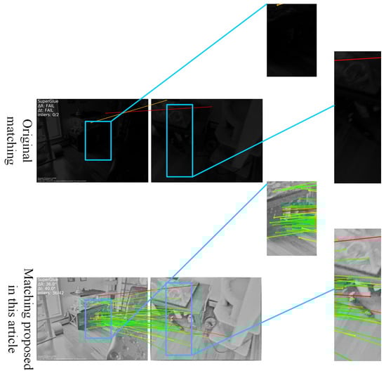 However, despite the proposed method’s capability to enhance feature point correspondence quantity and matching accuracy, significant challenges persist when processing low-quality, blurry low-light images. While the algorithm successfully establishes matches in such conditions, the inherent image blurriness continues to limit both the quantity and accuracy of feature correspondences. The challenge of improving matching quality for low-quality low-light images remains a substantial research concern. Furthermore, the current implementation maintains MSRCR and SuperGlue as separate algorithmic components rather than integrating them into a unified enhanced matching framework. Future research should focus on developing a cohesive algorithm that seamlessly integrates these complementary approaches into a single enhanced matching solution.