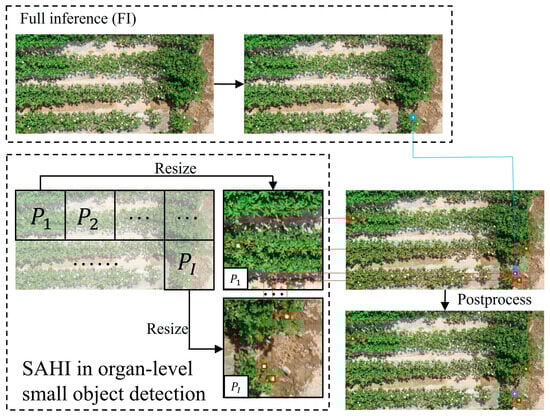 To address the issues of reduced detection precision and high computational costs, SAHI was employed as an auxiliary tool for detecting organ-level objects within UAV images of crop canopies. As illustrated in Figure 6, the original query image was first sliced into overlapping patches of size , represented as , , …, , and each patch was resized while preserving the aspect ratio. An object detection forward pass was then independently applied to each overlapping patch. An optional full inference (FI) could be applied to the raw image to detect larger objects. Finally, the overlapping predictions, along with the FI results if used, were merged back to the original size using Non-Maximum Suppression (NMS). During NMS, boxes with Intersection over Union (IoU) ratios exceeding the predefined matching threshold were matched, and for each match, detections with probabilities below the threshold were removed.
