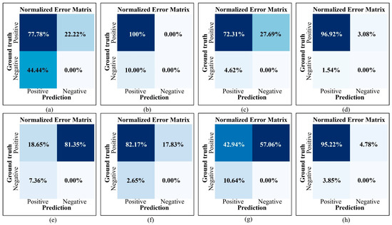 Normalized error matrix of Table 2: (a) DOM and (b) raw image of cotton canopy flowers; (c) DOM and (d) raw image of potato canopy flowers; (e) DOM and (f) raw image in rice panicles; (g) DOM and (h) raw image in cotton canopy bolls.