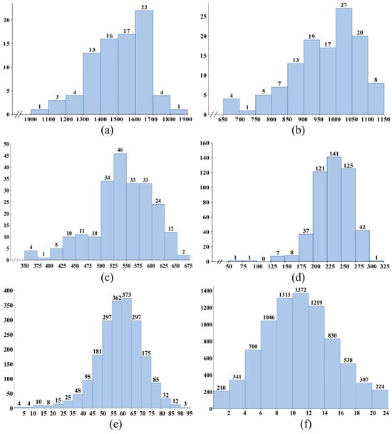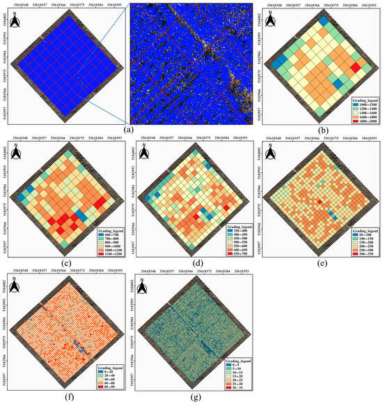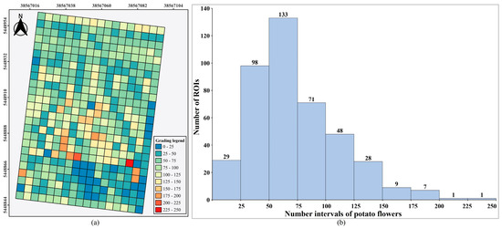 By analyzing the distribution of prediction box counts within each ROI, crop phenotypic information based on mapped prediction boxes in the DOM can be further clarified. As shown in Figure 12a, the number of prediction boxes within each ROI was calculated, grouped at intervals of 25, and visualized as a graded distribution map of potato flower counts. This graded map provides a clear view of the distribution of potato flowers across the sample field. Additionally, Figure 12b presents a histogram of the count distribution across these intervals. For example, using the ROI size in this study (), the area with potato flower counts in the range of (50, 75] covered the largest blooming area at 3325 m2, while areas within the (150, 250] range occupied only 450 m2.