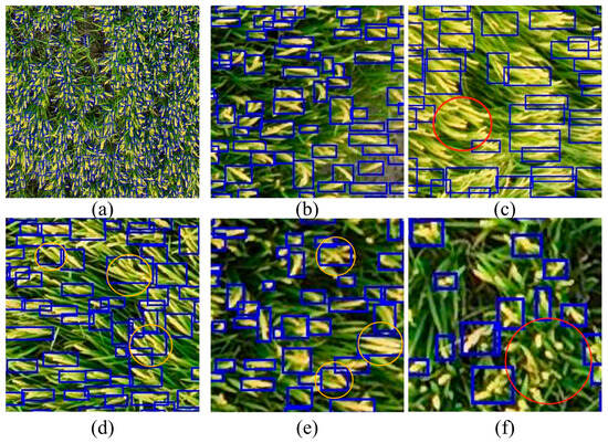 Figure 8(a1–h6) illustrate the comparison of crop canopy target detection via SAHI in the DOM and raw images. Red circles indicate false detections, while yellow circles denote missed detections. Through comparative analysis, the following primary causes of false detections were identified: