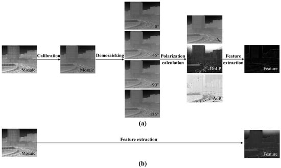 Feature extraction methods for DoFP polarization images: (a) indirect processing method based on calibration and demosaicking; (b) direct processing method based on mosaic images.