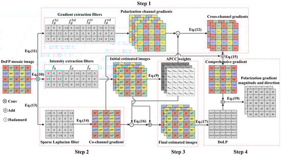 Given the aliasing characteristics of spatial and polarization information in polarization mosaic images, we adopt two gradient feature extraction strategies. First, cross-channel gradient feature extraction is achieved based on polarization distance and adaptive polarization channel correlation weights. Second, a sparse Laplacian filter is introduced to obtain the co-channel refined gradient feature.