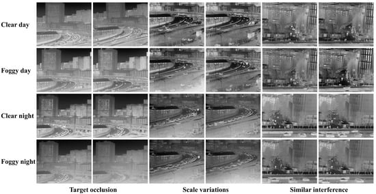 As shown in Figure 3, our constructed polarization mosaic dataset comprises 24 video sequences with a total of 8420 images, encompassing diverse scene conditions. The data collection process thoroughly considered the complexity of practical application environments, incorporating data acquisition schemes under different weather conditions (clear and foggy) and time periods (day and night). Additionally, to validate the algorithm’s robustness, we specifically constructed complex scenes including target occlusion, similar target interference, and dynamic target scale variations to comprehensively evaluate the feature extraction methods’ performance. To focus on evaluating the performance of the HPG feature descriptor in target tracking, we fixed the long-wave infrared DoFP polarization thermal imaging system during data collection.