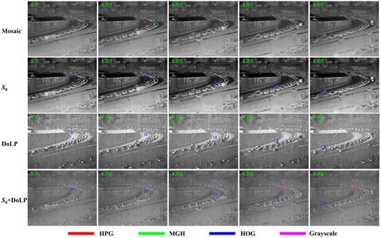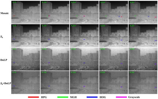 Figure 4 and Figure 5 present the qualitative tracking results of different feature extraction methods. The experimental results are arranged in rows showing the mosaic, S0, DoLP, and S0 + DoLP images, with five key frames displaying the tracking process horizontally. For mosaic images, we compared the performance of the grayscale, HOG, MGH, and HPG feature descriptors; for the S0, DoLP, and S0 + DoLP images, we focused on evaluating the performance of the grayscale and HOG feature descriptors.