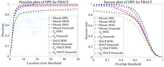 As illustrated in Figure 7, the optimal feature descriptor exhibits distinct variations across different tracking methods. For the TECF method, the top four features in both precision and success plots are the HPG feature from mosaic images and the HOG features from mosaic, S0, and S0 + DoLP images. For the EMCF method, the top four features are the HOG features from mosaic, S0, DoLP, and S0 + DoLP images. For the AutoTrack, ARCF, and GFS-DCF methods, the top four features are the HPG feature from mosaic images and the HOG features from S0, DoLP, and S0 + DoLP images. For the SRDCF method, the top four features are the HOG and HPG features from mosaic images, the HOG feature from S0 images, and the grayscale feature from DoLP images. For the ECO method, the top four features in precision plots are the HPG feature from mosaic images, the HOG feature from S0 images, and both the grayscale and the HOG features from DoLP images. The top four features in success plots are the HPG feature from mosaic images, and the HOG features from mosaic, S0, and S0 + DoLP images.