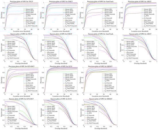 To validate the universality of the HPG feature descriptor, we applied it to seven representative correlation filtering-based tracking methods: SRDCF [25], ECO [26], GFS-DCF [27], ARCF [28], AutoTrack [29], EMCF [30], and TECF [31]. The SRDCF method enhances tracking precision by introducing spatial regularization terms to suppress filter coefficients in boundary regions, implementing an efficient optimization strategy based on Gauss–Seidel iteration. The ECO method incorporates factorized convolution operators to reduce model parameters while proposing a compact generative sample space representation based on Gaussian mixture models, significantly reducing memory and computational overhead. The GFS-DCF method introduces a feature selection mechanism in the channel dimension, enhancing filter discriminability and interpretability through the joint optimization of feature selection and filter learning. The ARCF method improves filter robustness using response map variation rates and employs cropping matrices to expand the search area, thereby enhancing system discrimination capability. The AutoTrack method features online adaptive learning of spatiotemporal regularization terms, focusing on learning reliable target components through spatial local response map variations while controlling filter update rates using global response map changes. The EMCF method, designed for maritime vessel tracking, combines translation estimation with scale estimation strategies and employs online random fern classifiers for re-detection, achieving stable long-term tracking. The TECF method enhances filter recognition capability using inter-frame environmental residuals and constructs temporal regularization terms from historical filter models, simultaneously suppressing boundary effects and preventing filter degradation. All these methods are based on the correlation filtering framework and utilize manually designed filters for feature extraction, making their structural characteristics conducive to embedding the proposed HPG feature descriptor. The precision and success plots of different tracking methods are illustrated in Figure 7, with a comparison of the results presented in Table 3.
